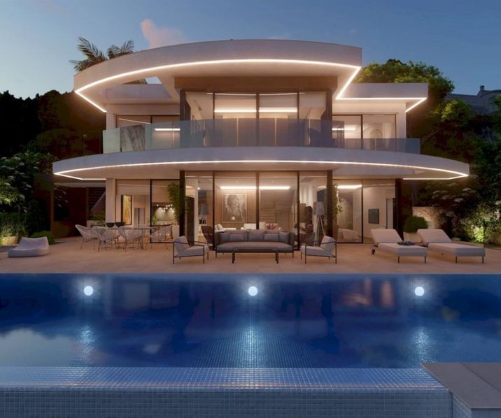 Luxurious and modern villa with panoramic views over the coastline of Moraira. This new construction project will be divided over 3 floors and offers a lift at your disposal. The central level has a spacious living room with dining area, an open and fully installed kitchen, a guest toilet, a master bedroom with walk-in dressing, an ensuite bathroom and a balcony. From the living room with large windows you can not only enjoy the beautiful views, but there is also direct access to the terraces around the infinity pool. Via the elevator or stairs you can go to the top floor with 3 spacious bedrooms with fitted wardrobes, 3 bathrooms ensuite and access to the balcony. The ground floor has a lounge area, a fitness room, a bathroom, a room for a sauna and a jacuzzi. The garden will be beautifully landscaped with several terraces around the pool and the BBQ area, garden lighting and automatic irrigation is also previewed. The landscaped driveway opens onto the ample parking space in front of the villa with carport.