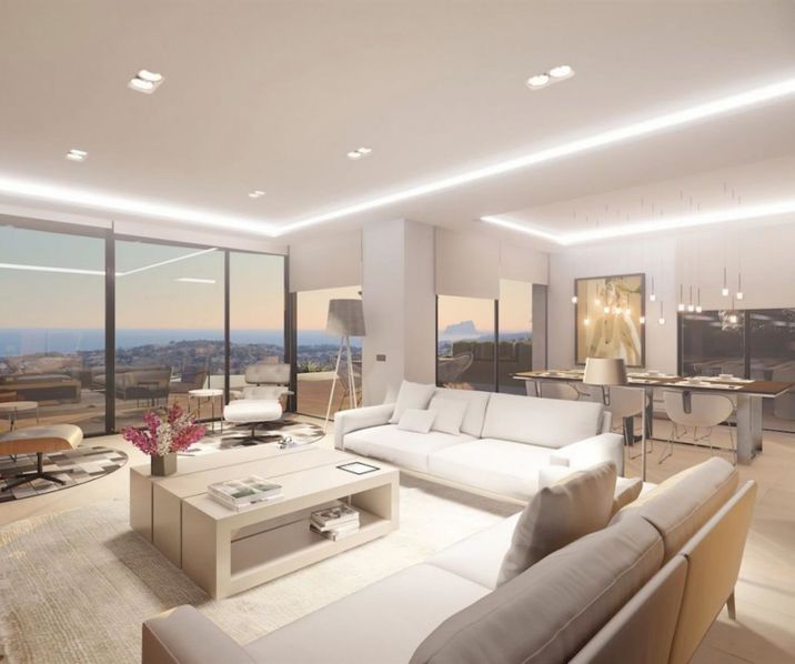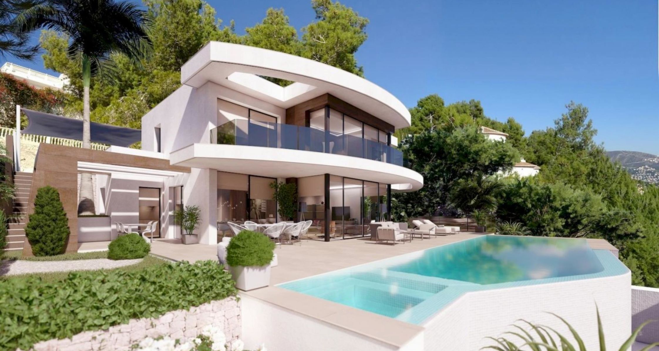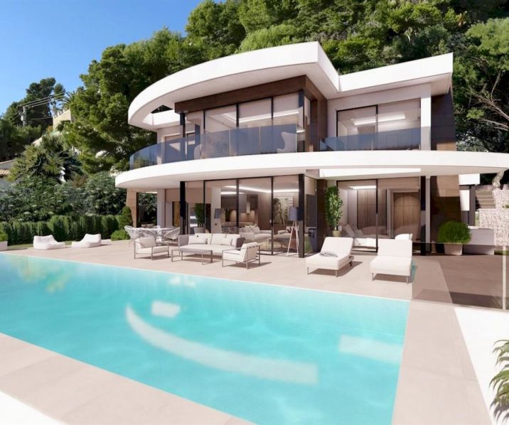 Luxueuze en moderne villa met panoramisch uitzichten over de kustlijn van Moraira. Dit nieuwbouw project zal verdeeld worden over 3 verdiepingen en biedt een lift ter uwer beschikking. De centrale level is voorzien van een ruime woonkamer met dineer-ruimte, een open en volledig geïnstalleerde keuken, een gastentoilet, een masterbedroom met inloop dressing, een badkamer ensuite en een balkon. Vanuit de woonkamer met grote raampartijen kan u niet alleen genieten van de prachtige uitzichten, maar tevens is er directe toegang tot de terrassen rondom het infinity zwembad. Via de lift of trap kan u naar de bovenste verdieping met 3 ruime slaapkamers met ingemaakte kasten, 3 badkamers ensuite en telkens toegang tot het balkon. De benedenverdieping is voorzien van een lounge area, een fitnessruimte, een badkamer, een ruimte voor sauna en een jacuzzi. Overigens zal de tuin mooi aangelegd worden met verscheidene terrassen rondom het zwembad en de BBQ ruimte, hiernaast is er ook tuinverlichting voorzien en automatische irrigatie. De aangelegde oprijlaan geeft uit op de ruime parkeergelegenheid vooraan de villa met carport.