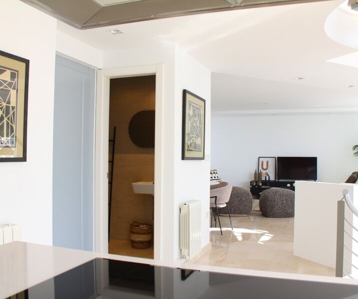 Deze villa beschikt op de benedenverdieping over een ruime inkomhal die uitgeeft op de trappenhal/lift, een garage, een bergruimte/wasplaats en terrassen. Op de hoofdverdieping is er een ruime woonkamer met dineer ruimte, een open en volledig geïnstalleerde keuken die uitgeeft op de terrassen met het private zwembad en de buitenkeuken met BBQ. De bovenste verdieping beschikt over een lounge area, 2 ruime slaapkamers met ingemaakte kasten en 2 badkamers ensuite. Daarnaast heeft de master bedroom niet alleen een badkamer ensuite maar ook een inloop dressing.