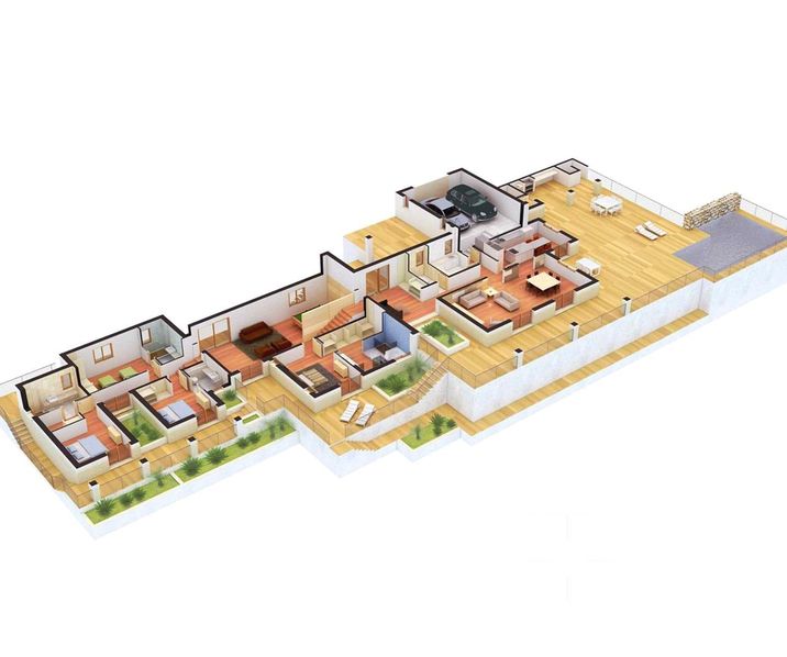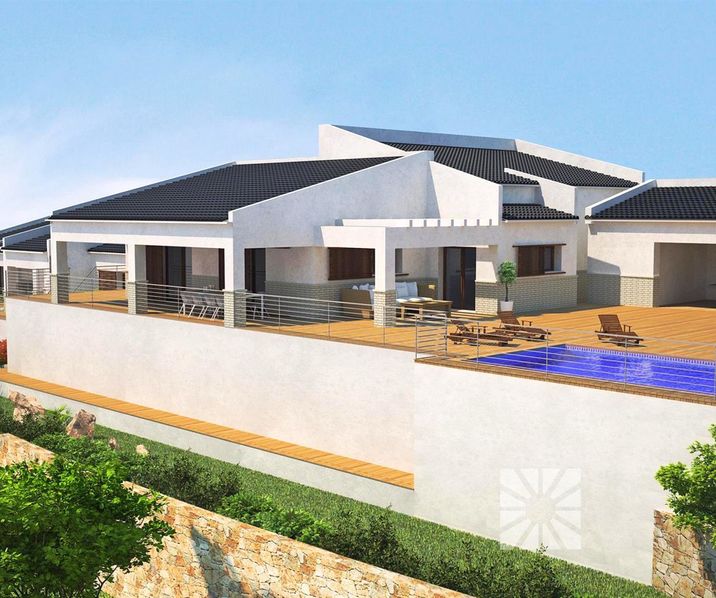 het exterieure geheel. De rechtervleugel is bestemd voor de slaapvertrekken, een zone die in twee niveaus verdeeld is door middel van een trap. Op het eerste niveau trekt de ruime lounge de aandacht. De decoratie volgt dezelfde lijnen als die van de hoofdzitkamer en van hieruit krijgt men toegang tot de hoofdslaapkamer.De hoofdslaapkamer bestaat uit drie ruime vertrekken: de slaapkamer met toegang tot het terras, de badkamer en de kleedkamer. Het tweede niveau bestaat uit nog drie slaapkamers, elk met badkamer ensuite en waarvan twee rechtstreeks toegang verlenen tot het terras met het prachtige zeezicht. Een heel persoonlijke woning, gedecoreerd met natuursteen en parket die haar schoonheid, elegantie en warmte verlenen. Patio's, grote raampartijen, Mediterraanse beplanting verwerkt in het terras, met stenen afgebakende aangelegde tuinen, een fusie van stijlen die van dit huis een uniek juweel maken. De volledige woning is voorzien van elektrische rolluiken, airconditioning H/C van het merk Daikin, sanitaire voorzieningen van het merk ROCA, vloerverwarming etc.