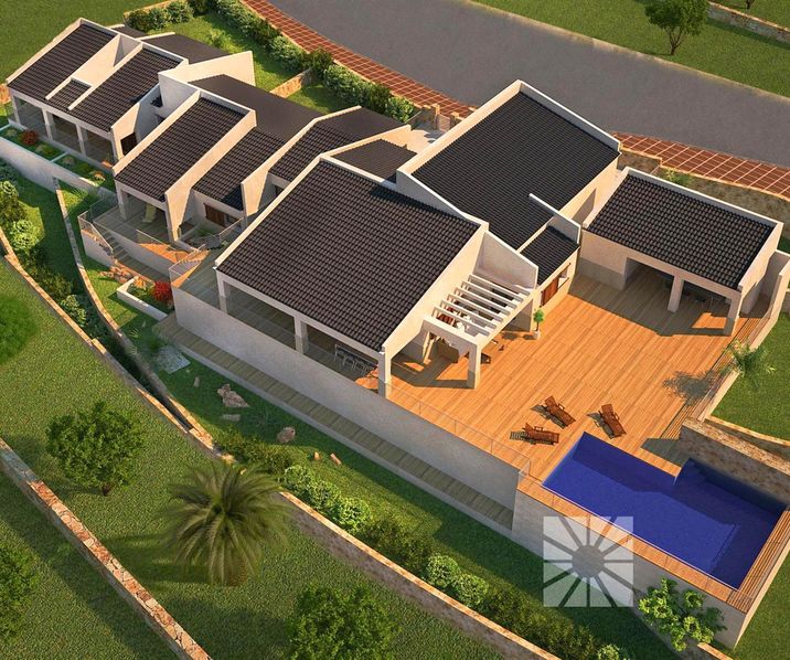 Het terras is een essentieel onderdeel van de woning en is bedekt met een houten Visendum-vloer die de volledige villa omringt. Naast de keuken en dineer ruimte vindt u het diepblauw zwembad, strategisch aangelegd om optimaal van het prachtige uitzicht op zee te genieten. De barbecue en dineer ruimte vervolledigen