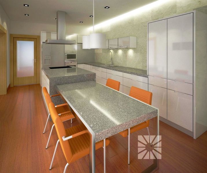 De villa is verdeeld over 2 vleugels namelijk een dag en een nacht vleugel. De inkomhal beschikt over een grote glazen wand waardoor de omgeving en de zee deel uitmaken van uw interieur. Het centrale vertrek is de ruime woonkamer en dineer ruimte, een elegant geheel waarin de parketvloer gecombineerd wordt met in natuurkleuren en wit beklede muren. Naast de zitkamer treffen we de volledig geïnstalleerde keuken aan, een ruime en lichte ruimte met gelakt meubilair. Opvallend is het centrale gedeelte met het kook eiland, dat uitgerust is met een glaskeramische kookplaat en een daaraan verbonden dineer tafel. De keuken staat in verbinding met een veranda die voorzien is van lounge zetels en met toegang tot het terras met zwembad en barbecue ruimte.